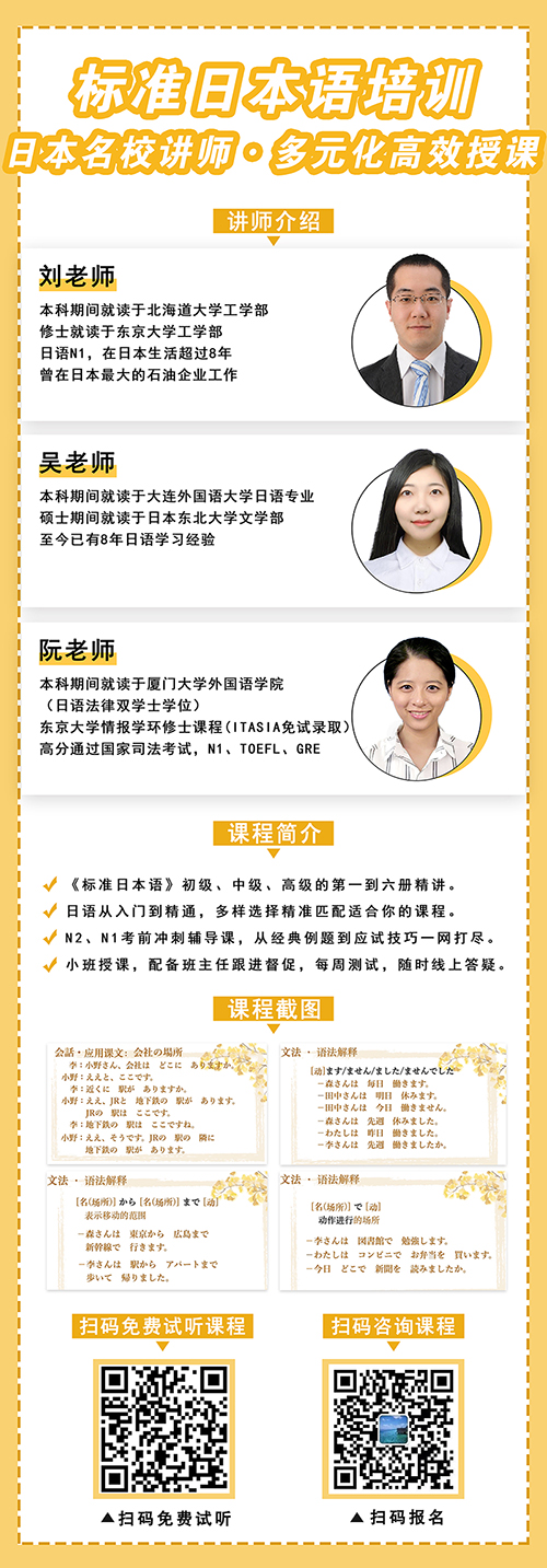 課程講師均畢業(yè)于日本國立名校,有豐富的留日經(jīng)驗(yàn)和日語授課經(jīng)驗(yàn),教你地道的日語和應(yīng)試備考技巧。